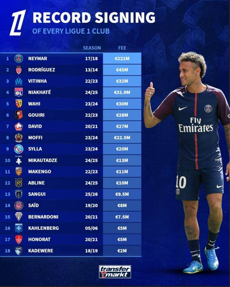 法甲标王转会费榜:巴黎2.22亿欧签内马尔居首,勒阿弗尔仅200万